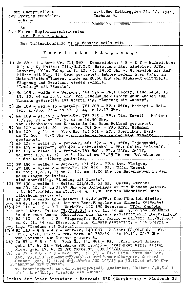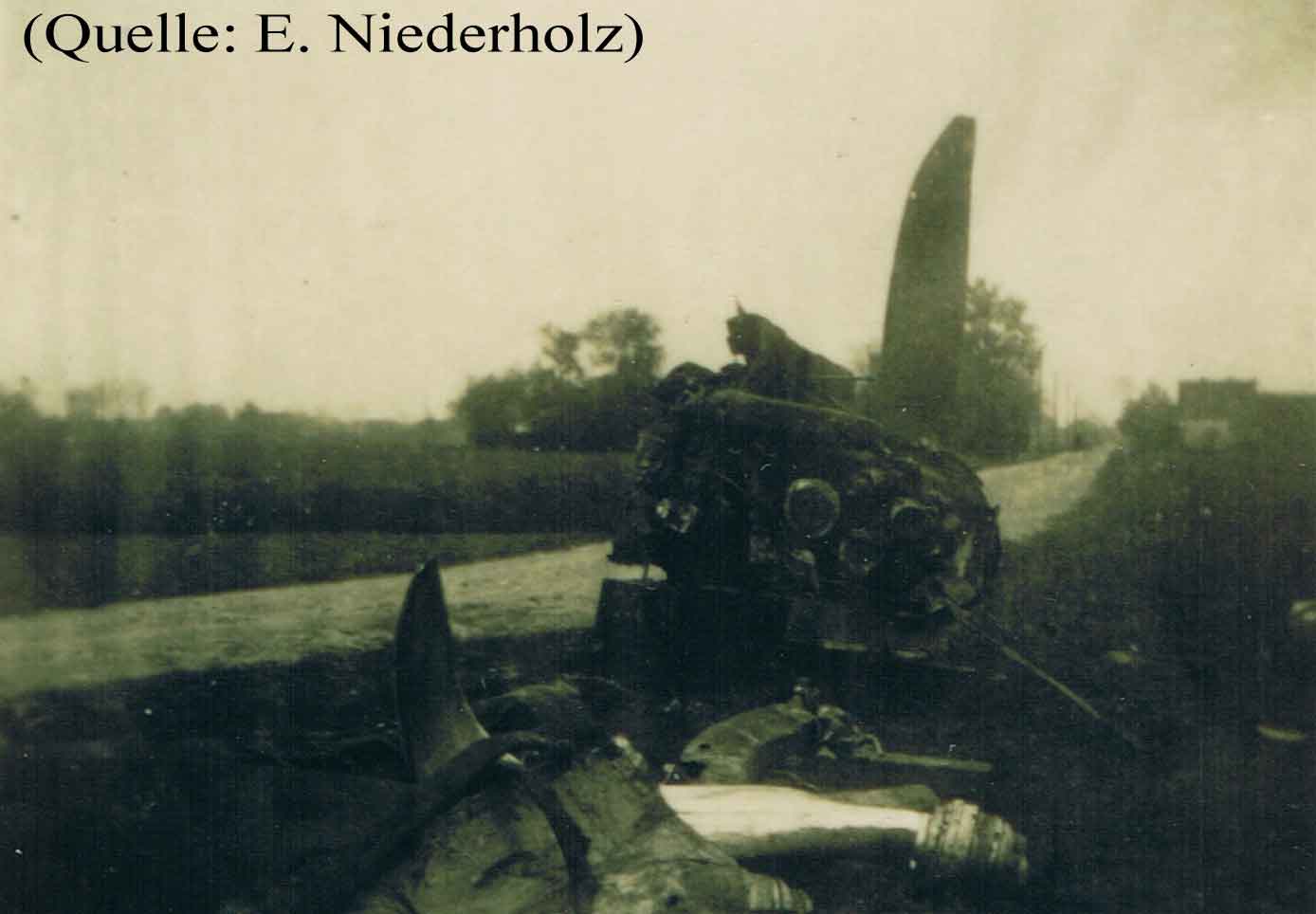 Darunter: Ende 1944 entstand diese Aufnahme einer zerstörten Bf 110 auf der Mittelstraße in Kamp-Lintfort. Es ist davon auszugehen, daß die Aufnahme am 18. Dezember entstand, nachdem die Bf 110 WNr. 180336 der 11./NJG 1 "bei Bönninghardt" abgestürzt war. Auch der Absturz der Bf 110 WNr. 2694 der 3./NJG 1 am 12. April 1942 ereignete sich weitab vom Flugplatz, sehr wahrscheinlich in Repelen.