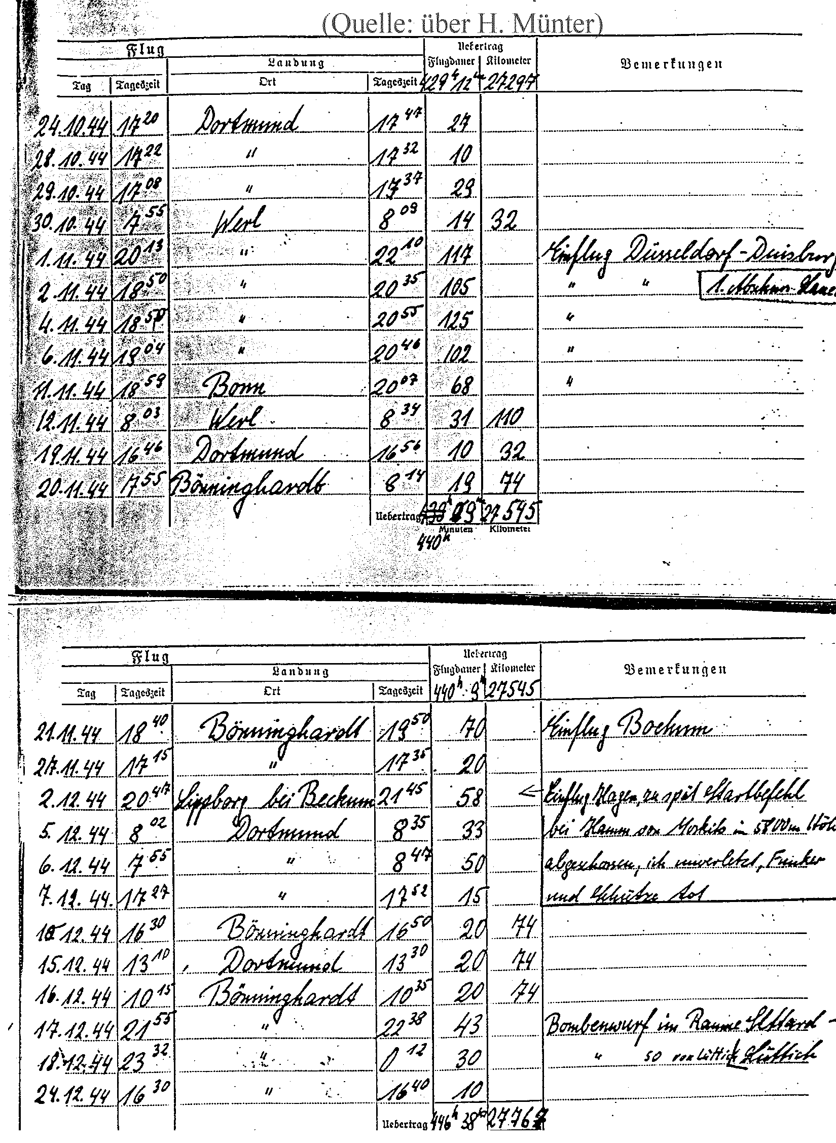 Auszug aus dem Flugbuch von Leutnant Hans-Joachim Schlage, IV./NJG 1. Die Eintragungen sprechen für sich.