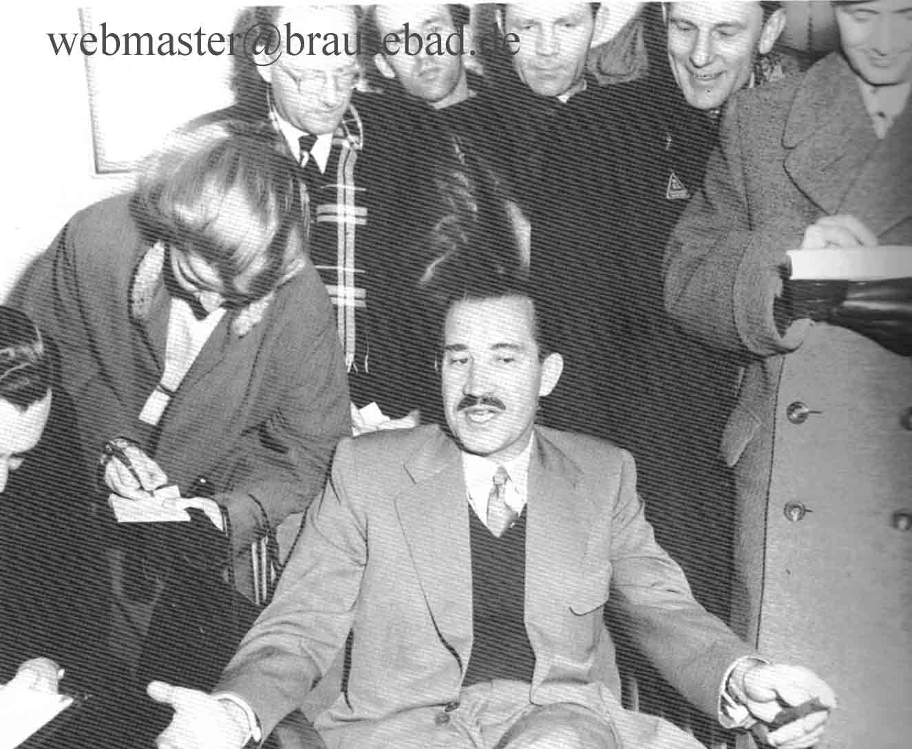 Links: Adolf Galland bei einem Presseempfang 1955. Er war gerade aus Argentinien zurückgekehrt, wo er einen Beratervertrag wahrgenommen hatte. Er war - wie Mölders - nie in Bönninghardt, möglicherweise aber der Leutnant in der Mitte des rechten Fotos: Walter Scheel, Bordfunker und Adjutant in der III./NJG 1.