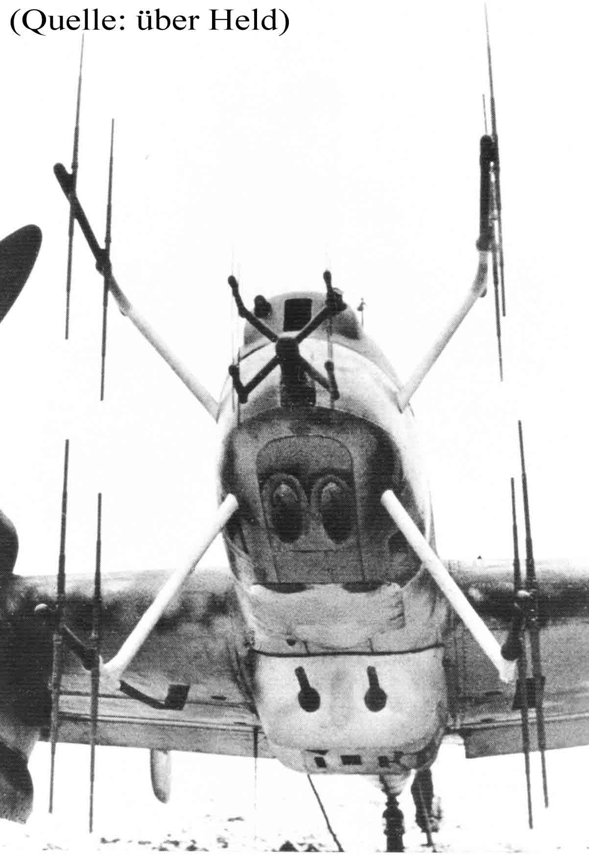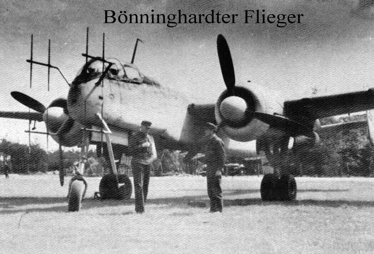 Links: Das "Geweih" eines Me 110-Nachtjägers (Radarantennen). Rechts: Eine Heinkel 219, davor Hauptmann Förster, Stab/NJG 1 (gefallen 1. Oktober 1944 in Münster-Handorf) und sein Bordfunker. Förster war mit Gewißheit gelegentlich in Bönninghardt, möglicherweise ist diese Aufnahme auch dort entstanden (im "Wendehammer").