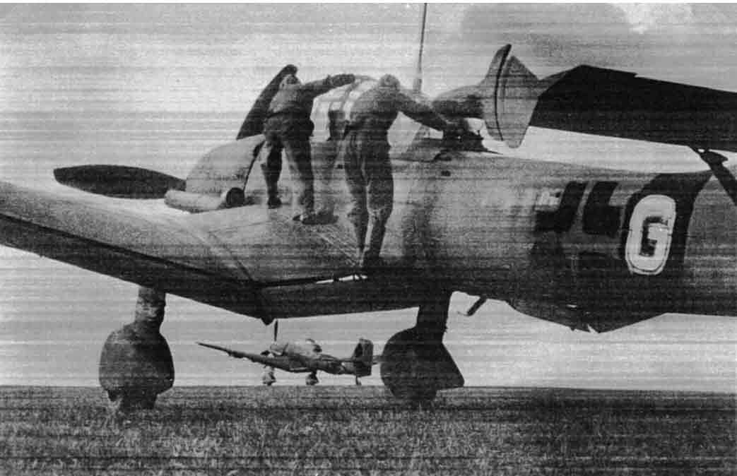 Links: Die Besatzung einer Nachschlachtgruppe steigt in ihre Maschine. Diese Ju 87 hatten alle entbehrlichen hellen Markierungen übermalt sowie Flammenvernichter an den Auspuffstutzen. Rechts eine sog. Jericho-Trompete. Diese kleinen Holzpropeller an der Fahrwerksverkleidung waren beim Stuka für den furchteinflößenden Heulton der Maschine beim Sturzangriff verantwortlich.