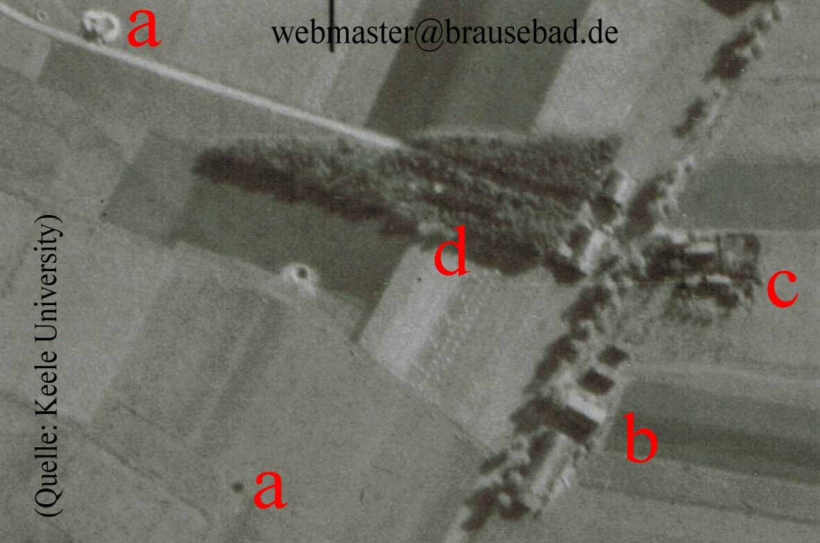 Detailausschnitt einer Auf-nahme von der Nordostecke des Flugplatzes von Oktober 1944 (Einmündung des Höhenweges in die Bönninghardter Straße). Bei a oben hat offenbar ein eingegrabenes "Drehfeuer" (drehbarer Scheinwerfer) die Funktion eines Landeleitlichts übernommen, bei a unten ist noch der Standort des zweiten Scheinwerfers zu erkennen. Bei b ein nach dem Krieg (nach dem Ausbau der Bönning-hardter Straße zur heutigen Ampelkreuzung mit der B 58) abgerissener Bauernhof, dessen Name offenbar über die Jahre in Vergessenheit geraten ist. Bei c die Häuser der Familie Thielen, im Waldstück erkennt man über d ein längliches Gebäude. Rechts neben dem Waldstück zwei Feldhäuser.