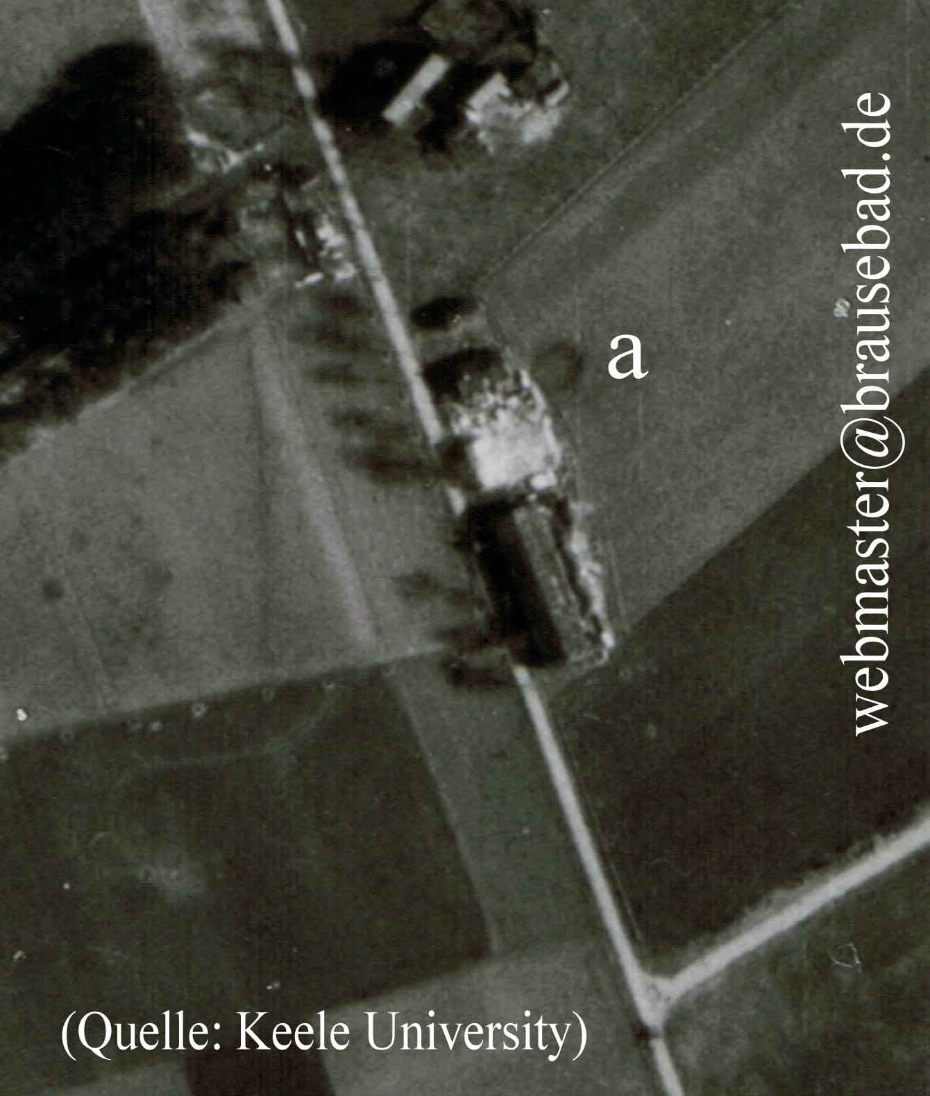 Offenbar ist nach kurz Weihnachten 1944 ein Nachtjäger in eine Scheune des oben erwähnten Bauernhofs gestürzt. Bei a erkennt man deutlich die zerstörte Scheune sowie einen großen Brand- oder Löschwasserfleck. Unten rechts die Einmündung der heutigen Straße "Am Flughafen" in die Bönninghardter Straße (Ausschnitt einer Aufnahme vom 21. Februar 1945). Zum Zeitpunkt der Aufnahme war der Flugbetrieb bereits eingestellt.