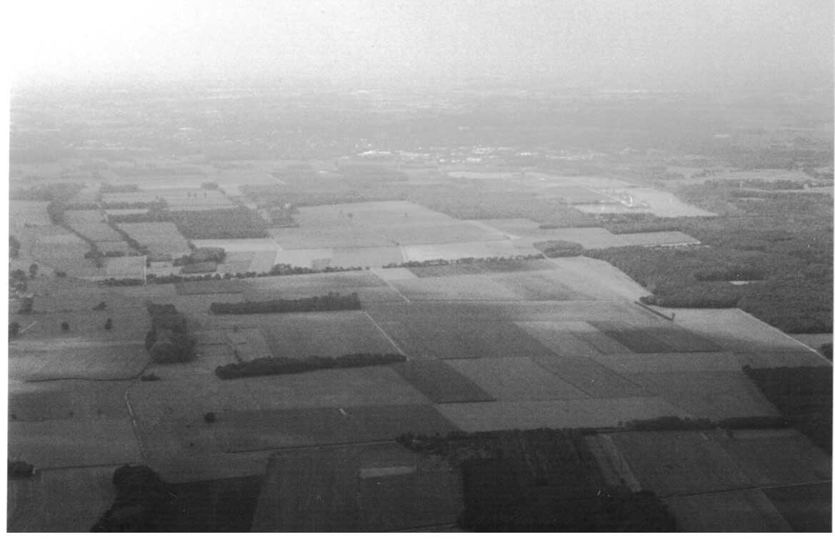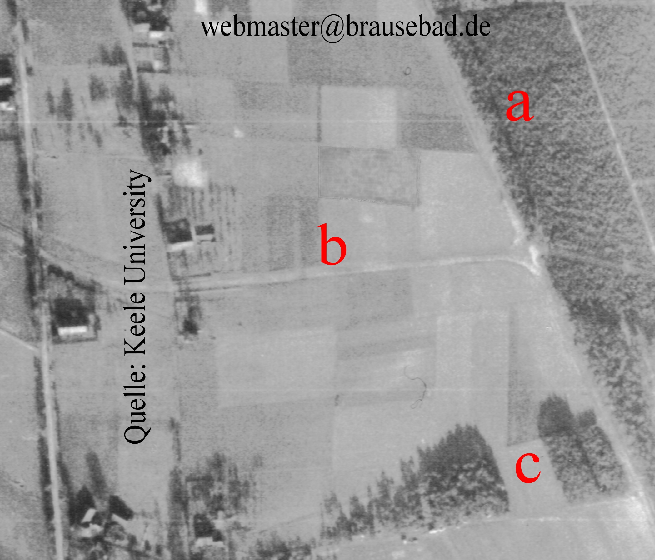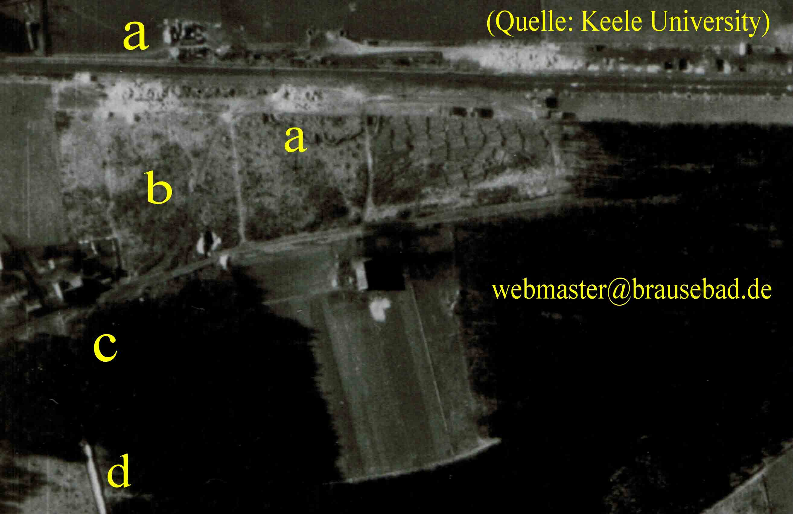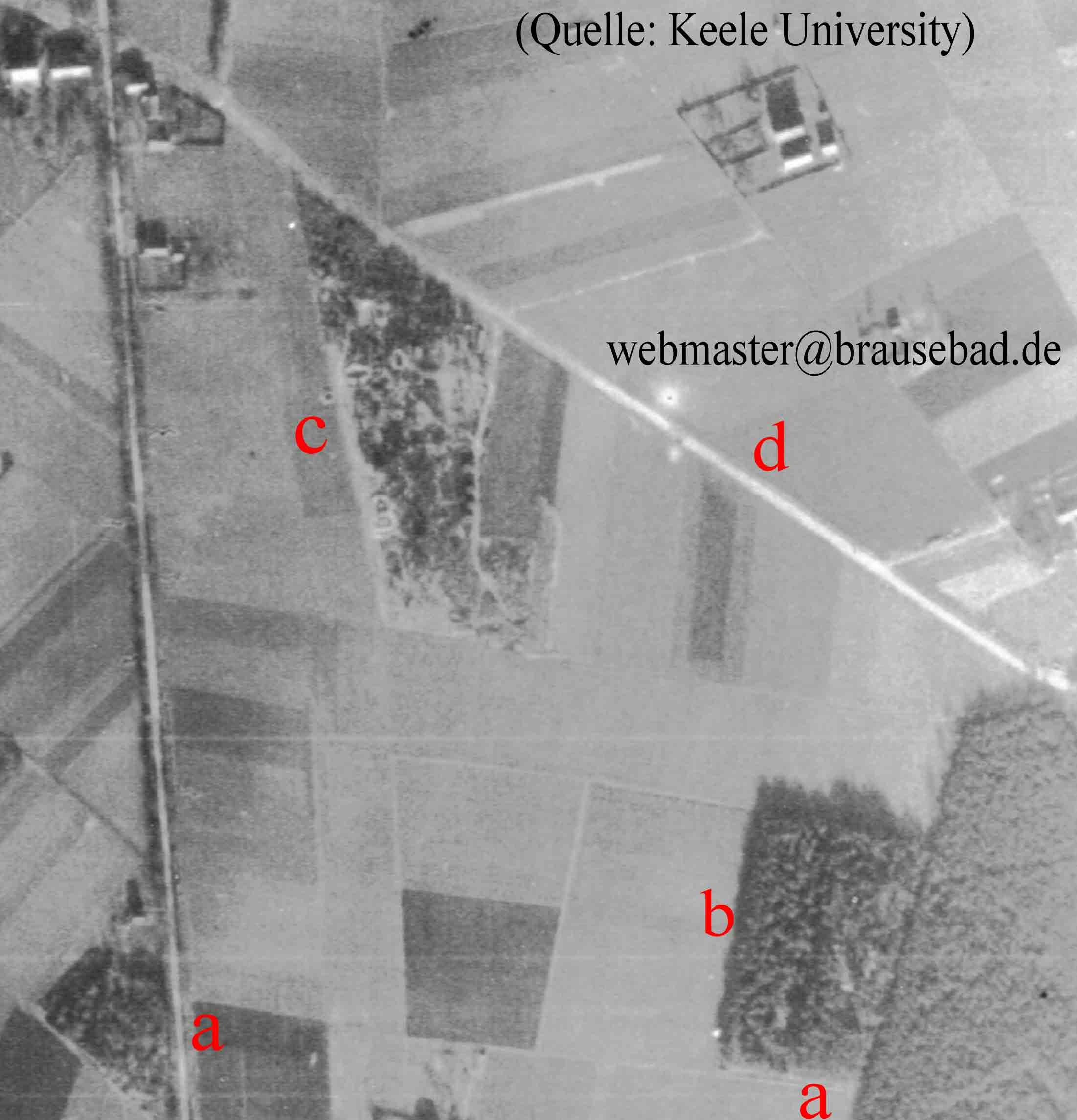 Dieser Ausschnitt entstand etwas weiter südlich. Bei c der heutige Jugendzeltplatz am Waldweg d. Im Waldstück b sind ebenfalls Stellplätze größerer Behälter sichtbar. Die Linie von a nach a markiert in etwa die südöstliche Grenze des Flughafengeländes. Anfang 1998 wurden dort in einer bemerkenswerten räumlichen Anordnung Bäume gepflanzt.