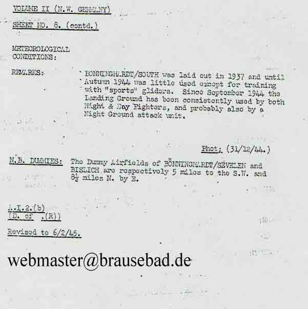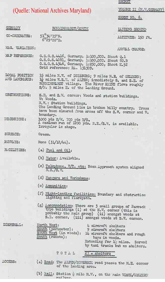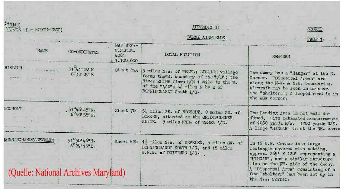 Die alliierte Aufklärung setzte in Westdeutschland erst nach der Landung in der Normandie umfangreich ein. Bis dahin blieben kleinere Einsatzhäfen und S-Häfen weitgehend unbekannt. Wie aus dem US-Dokument hervorgeht, gab es Scheinflughäfen auch in Bislich (wahrscheinlich in der Bauerschaft Schüttwich) und bei Bocholt im heutigen Naturschutzgebiet Große Dingdener Heide.
