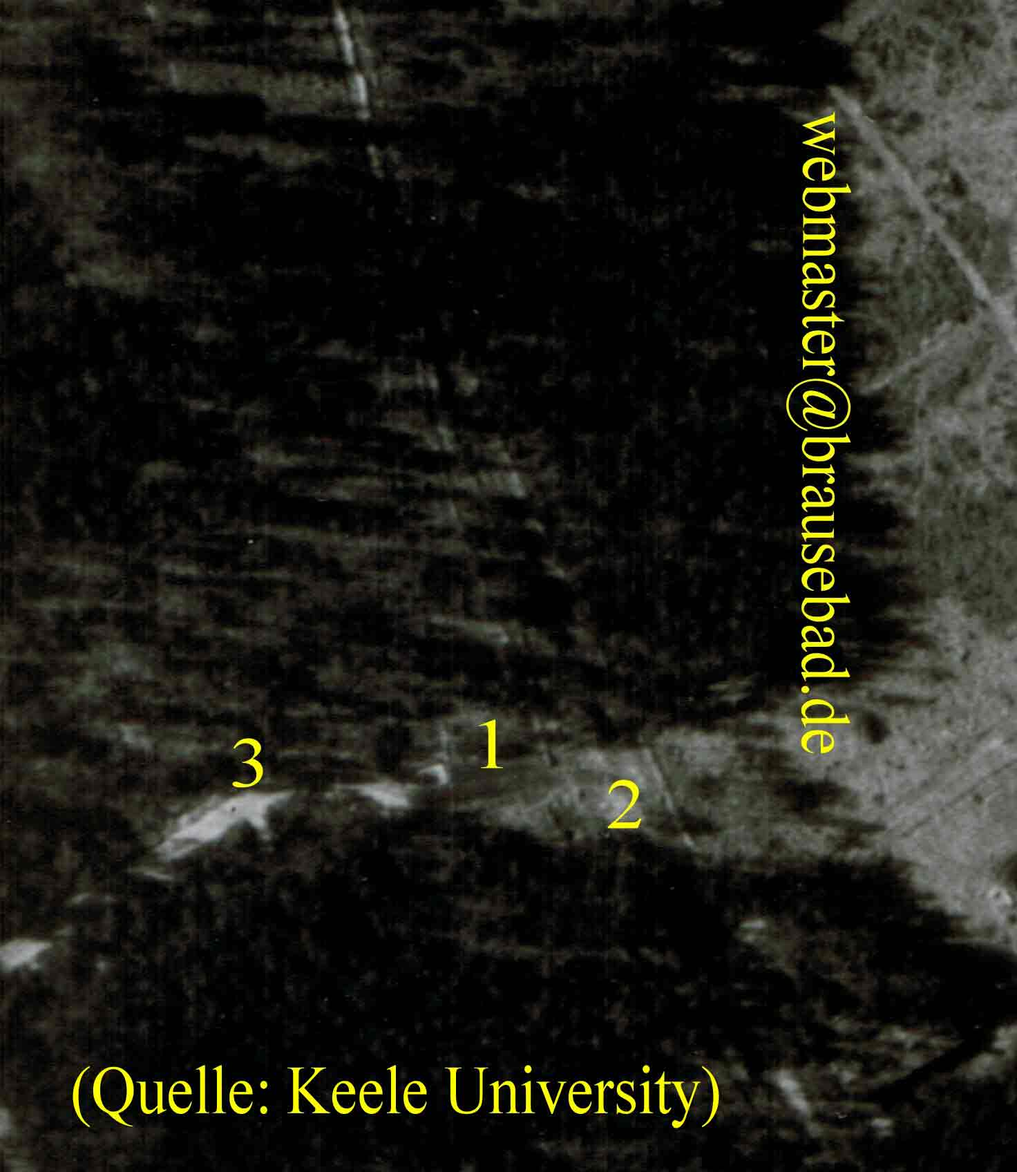 Links und rechts neben 1 erkennt man deutlich die Endpunkte der Schmalspurgleise, bei 2 erkennt man heute noch den Verladeplatz anhand einer ins Feld ragenden Asphaltfläche. Auch der Weg 3 existiert heute noch, nunmehr mitten im Feld. Er gehört offenbar dem Rechtsnachfolger der damaligen Liegenschaftsverwaltung der Luftwaffe und wird nicht umgepflügt.