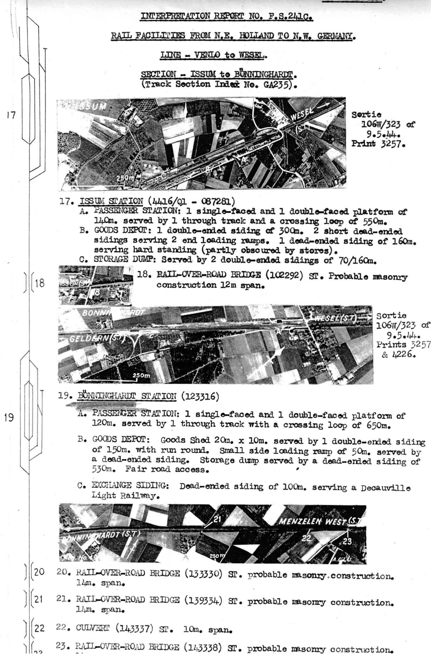 Eine detaillierte alliierte Lagebeschreibung des Bönninghardter Flugplatzes lag aus bereits geschilderten Gründen erst Ende 1944 vor (oben). Unten: Die Bahnlinien waren wegen ihrer Bedeutung für den Transport von Rüstungsgütern aller Art von besonderem Interesse. Auch die Strecke der Köln-Mindener Bahn bei Bönninghardt rückte in den Fokus der Luftaufklärung. Trotzdem wurden beim bekanntesten Angriff auf einen Zug auf der Hei nicht Rüstungsgüter, sondern Zivilisten getroffen. An jenem 30. März 1944 gab es viele Fahrgäste, die den Bönninghardter Bahnhof nur noch tot, mit großen Einschußlöchern von der Flugzeugmunition, erreichten.